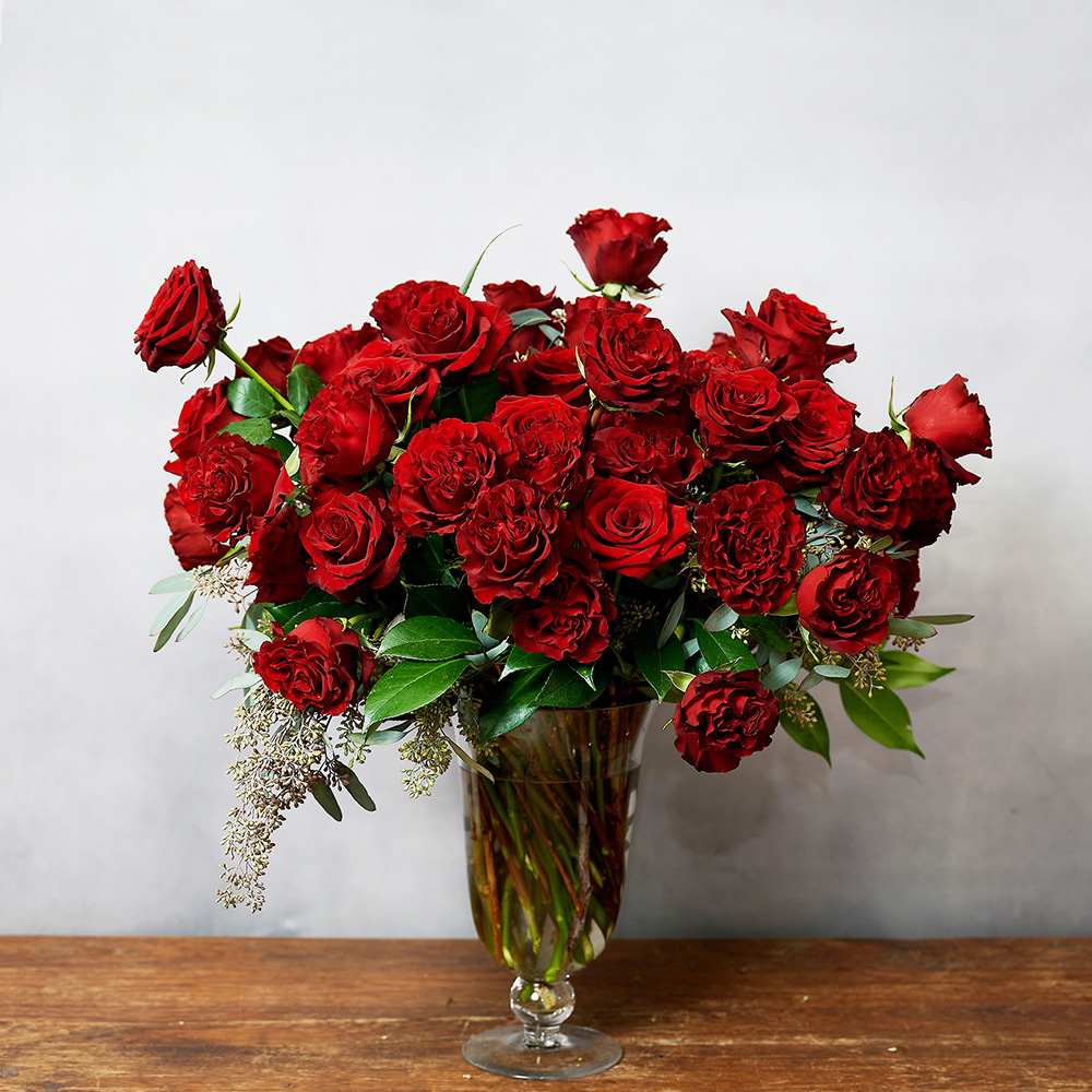 18-28 or-50 stems of premium red roses accented with delicate seeded eucalyptus and seasonal greenery.